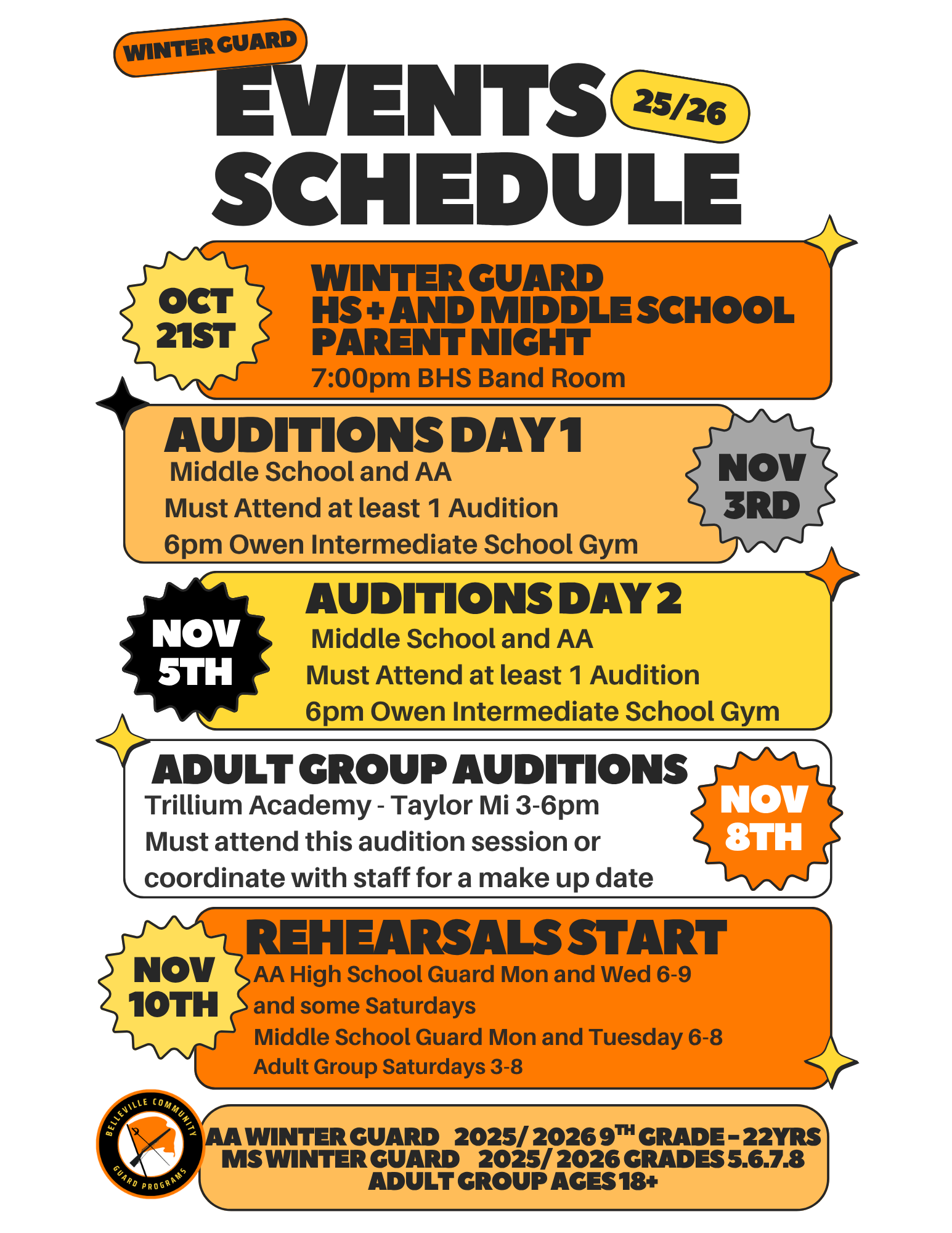 Come get information about the upcoming 18+ Winter Guard season. Detailed membership packets will be distributed.